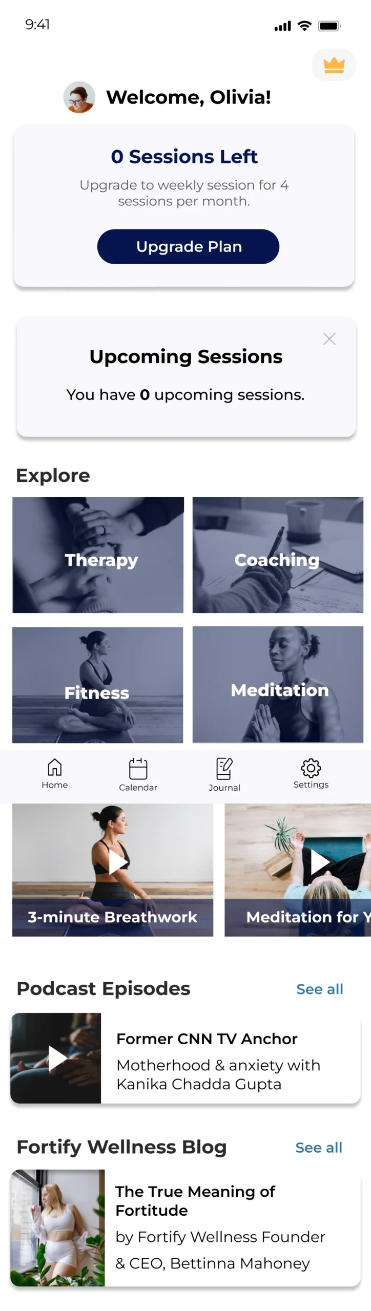 Fortify Wellness is a digital wellness platform designed to integrate therapy, coaching, fitness, and meditation into a seamless mobile experience. I developed this subscription-based app with a focus on accessibility and user engagement, ensuring that individuals can easily connect with licensed therapists, certified coaches, and wellness experts.